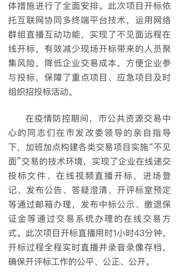 此次招標依托互聯(lián)網(wǎng)協(xié)同多終端平臺技術(shù),運用網(wǎng)絡(luò)群組直播互動功能,實現(xiàn)了“不見面”遠程在線開標,有效避免了人員聚集和交叉感染的風(fēng)險,同時降低了企業(yè)交易成本,方便企業(yè)參與投標。是疫情防控以來西安市公共資源交易中心首個恢復(fù)項目,在疫情防控的特殊時期,保障了我市重點、民生項目的順利推進,為我市發(fā)展電子化“不見面”招投標提供了寶貴的經(jīng)驗。