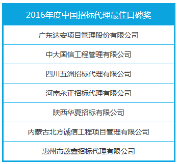 2016年度中國招標(biāo)代理最佳口碑獎(jiǎng)